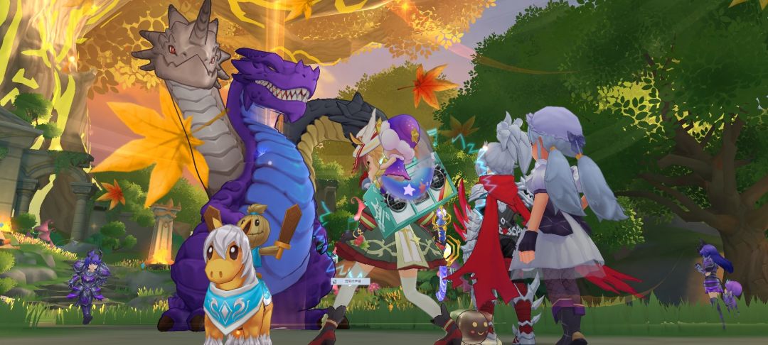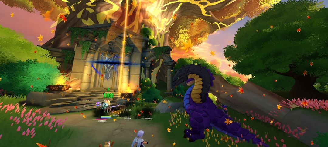 我立刻开启清除落叶的战斗模式(锁定——攻击),那些紊乱的落叶便化作点点荧光消散。随着落叶清除,结界瞬间出现一道缺口,与此同时,一声巨响传来,失去力量支撑的诺顿轰然卧倒在地。