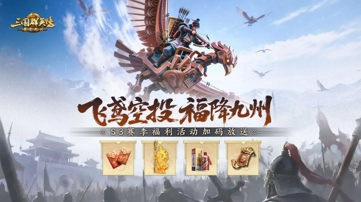 ●飞鸢空投・福降九州:通过活动任务获取「飞鸢神木」积分,抽取大量元宝、赐福鸢羽、最高648代币!更有机会赢取500ml茅台、绒沙金关羽雕像、九州周边等重磅实物好礼!更多活动内容查看👉情报司丨S3福利再加码!元宝代币、绒沙金关羽、茅台等你来赢!