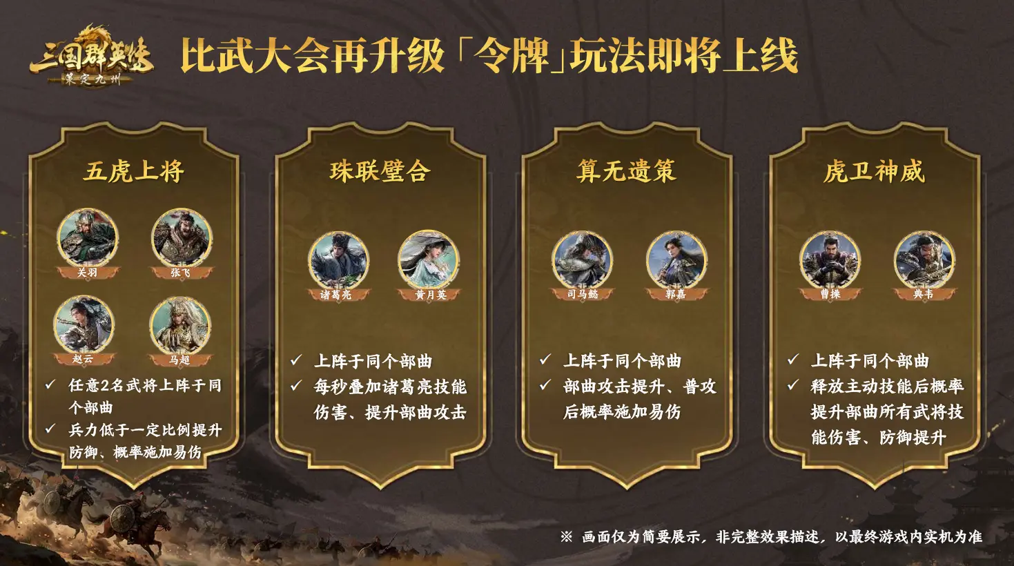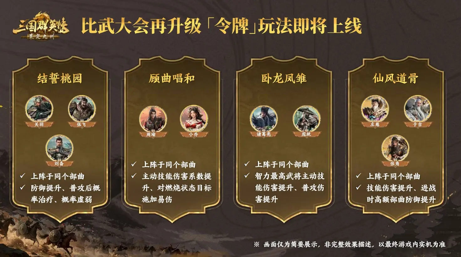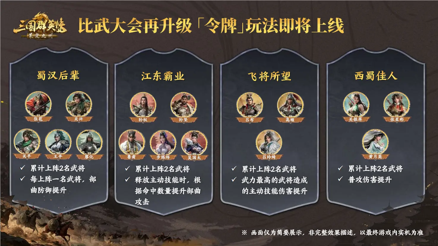 比武大会新增「令牌」玩法,组队策略性翻倍,解锁指定武将组合即可激活强力加成,以下是羁绊介绍哦~
