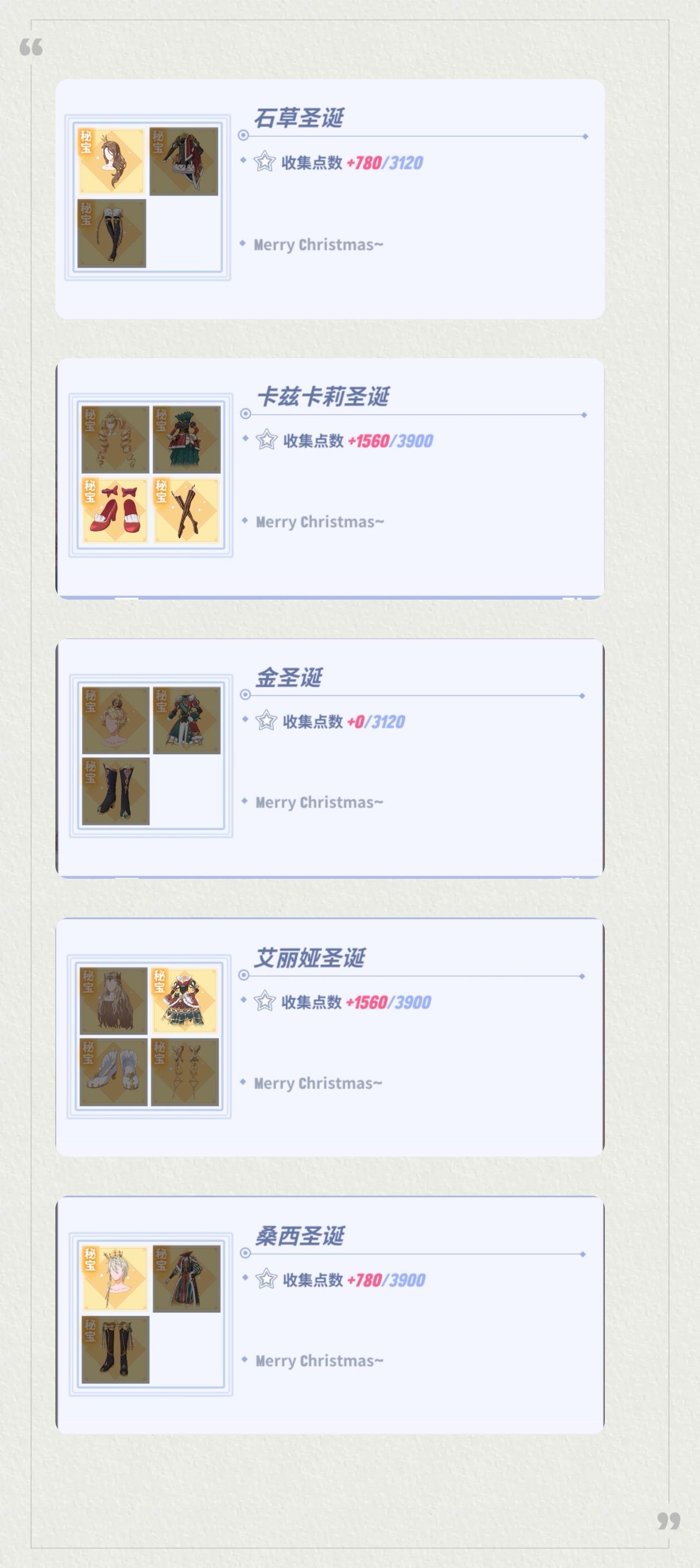 圣诞服装奖励+吧唧奖励:爱情(大师积分榜)、不眠之夜253(专业积分榜)、睡不着的夜(休闲积分榜)、苑丹~(大师奖杯榜)、璞苒(专业奖杯榜)、风源夜猎(休闲奖杯榜)