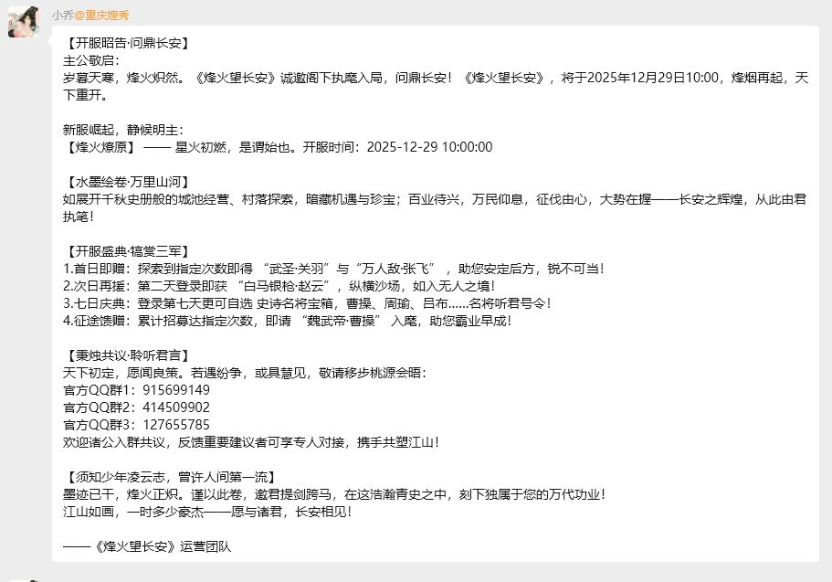 烽火望长安12月29日早上十点正式开服