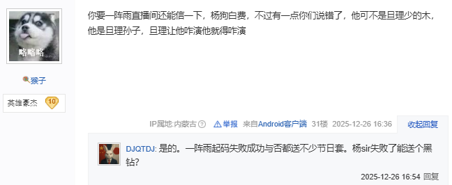紧接着在12.26晚上一阵雨的直播中,一阵雨对着自己助理狂喷,原来是号主之前找过他助理,结果助理没当回事,也没回复,然后号主找了杨sir,这也就与d助那名玩家说的完全对上了