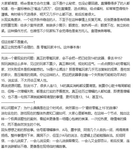 就像上边这个长篇小作文,楼主洋洋洒洒写了几百字,总结下来就是“我觉得”主播跟官方有合作,“我觉得”正常人不会上15,“我觉得”是官方的阴谋,另外这篇小作文开篇第一句就错了,主播杨sir不是手游官签主播,在上周的土龙比赛上因为官方不给非官签主播资源,因为这事杨sir跟官方闹得不太愉快,联合手游一众顶氪大佬集体退赛,相信这事不少人都知道