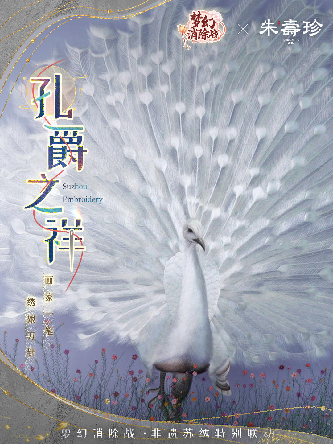 这幅作品以三十余种深浅各异的白,绣出孔雀如玉清辉。