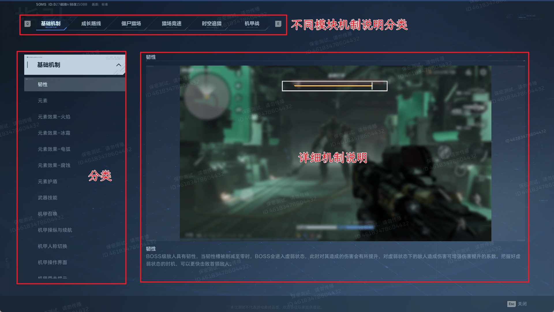 该界面分为三个区域,即最顶部的不同模块的机制分类页,左侧的当前模块机制详解分类和右侧当前机制的详细说明;逆行者们可以在这里了解到关于基础机制、成长路线、僵尸猎场、猎场竞速、时空追猎及机甲战的各类机制,其中的说明非常详细,在看完后各位对于基础机制的了解将更进一步。