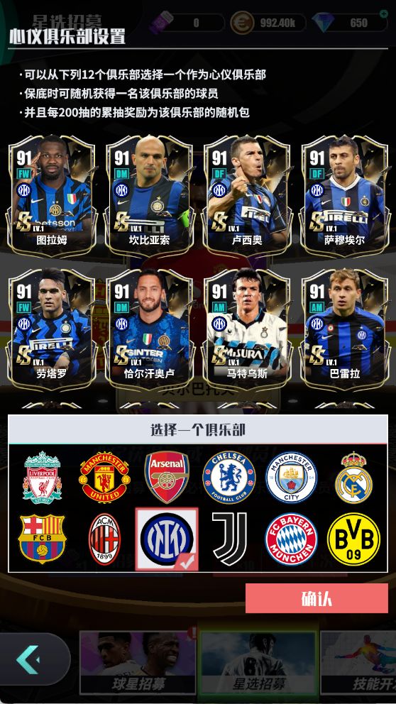 玩家可以在游戏中的星选招募中选择国际米兰作为自己的心仪俱乐部,增加抽到国际米兰球员的概率,并且保底时可随机获得一名该俱乐部的球员,并且每160抽的累抽奖励位该俱乐部的随机包。