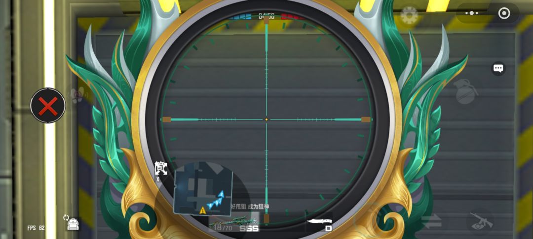 开镜画面看着非常炫酷!瞄准镜外圈裹着一圈青绿色的羽翼装饰,还混着银白的边,跟枪身的青龙风格特别搭,看着就很有质感,准星是亮眼的青绿色十字线,以及中间的黄色小点,看得清清楚楚,提升了这款神狙的准度。