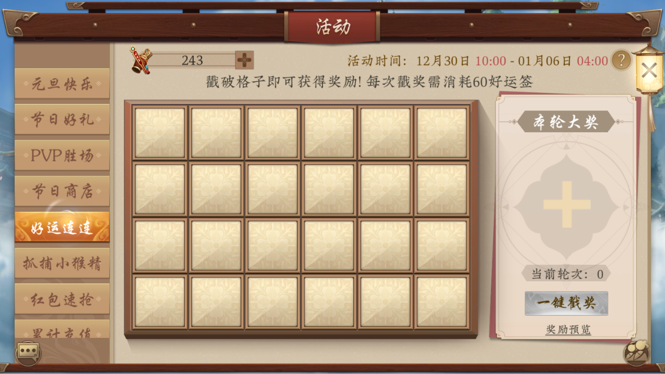 玩家可以消耗道具“好运签”戳奖,获得随机奖励,并有可能获得自选大奖!