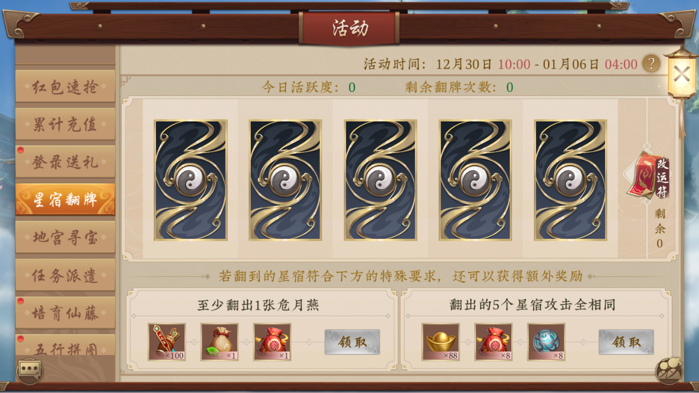 活动期间,玩家每获得30点活跃度,便可获得1次翻牌机会,每日上限5次。每翻一张牌会消耗1次翻牌机会。