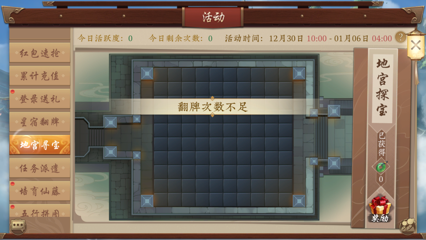 拥有寻宝次数后,点击地宫中的任意小方格的地砖,即可翻开对应小方格,并获得随机物品奖励。