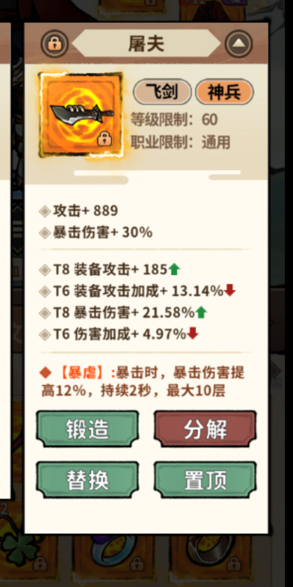 2、飞剑强化装备攻击3次以上,弑仙没有T级要求,屠夫t8毕业。魔化攻击力加成(弑仙便宜所以我们魔化2次不好就分解,再做一个)。