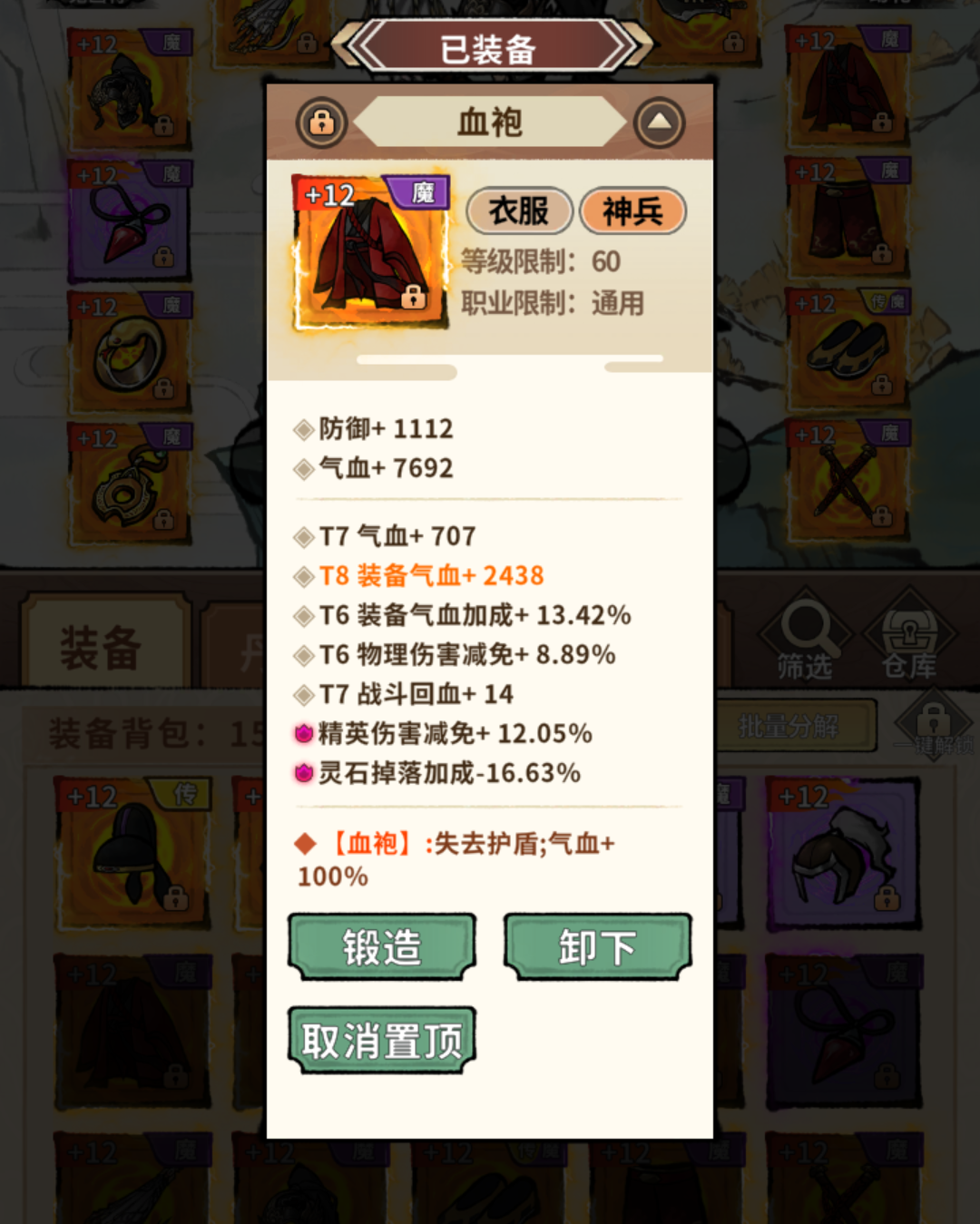 衣服 血袍(t8装备气血最优)魔化伤害减免,精英伤害减免