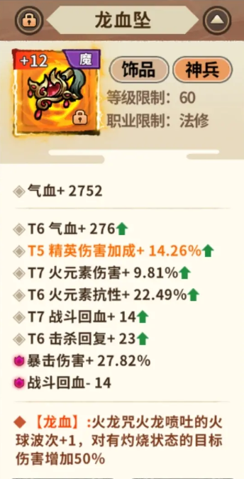 购买装备时请注意,购买特殊词条火龙咒火龙喷吐波次+1,对灼烧目标伤害+50的。