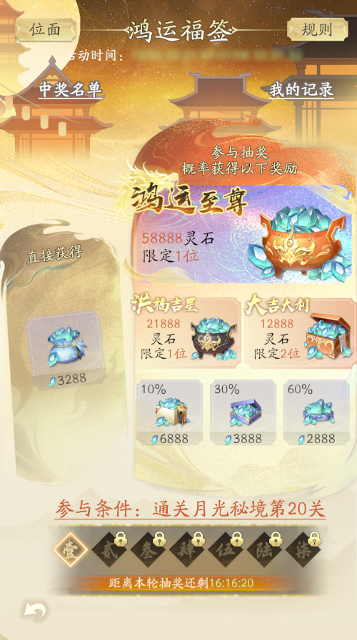 抽取福签:有机会中签获得至尊超级奖励、鸿运吉星奖、大吉大利奖,也有概率获得普通奖励。