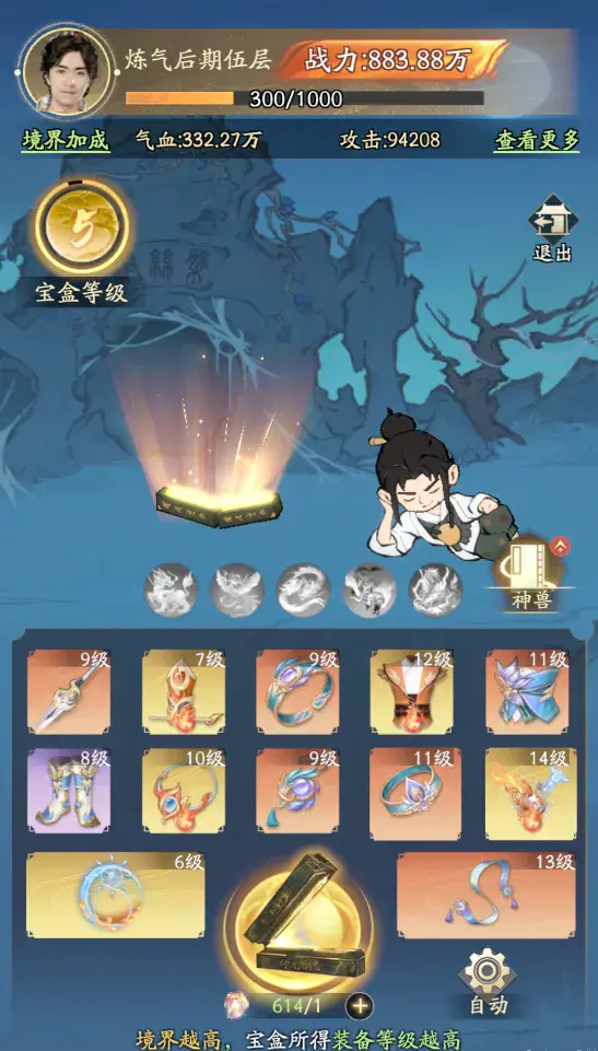 玩法简介:消耗月华,帮助至尊宝炼化装备,提升至尊宝和宝盒的等级,提供超强属性加成