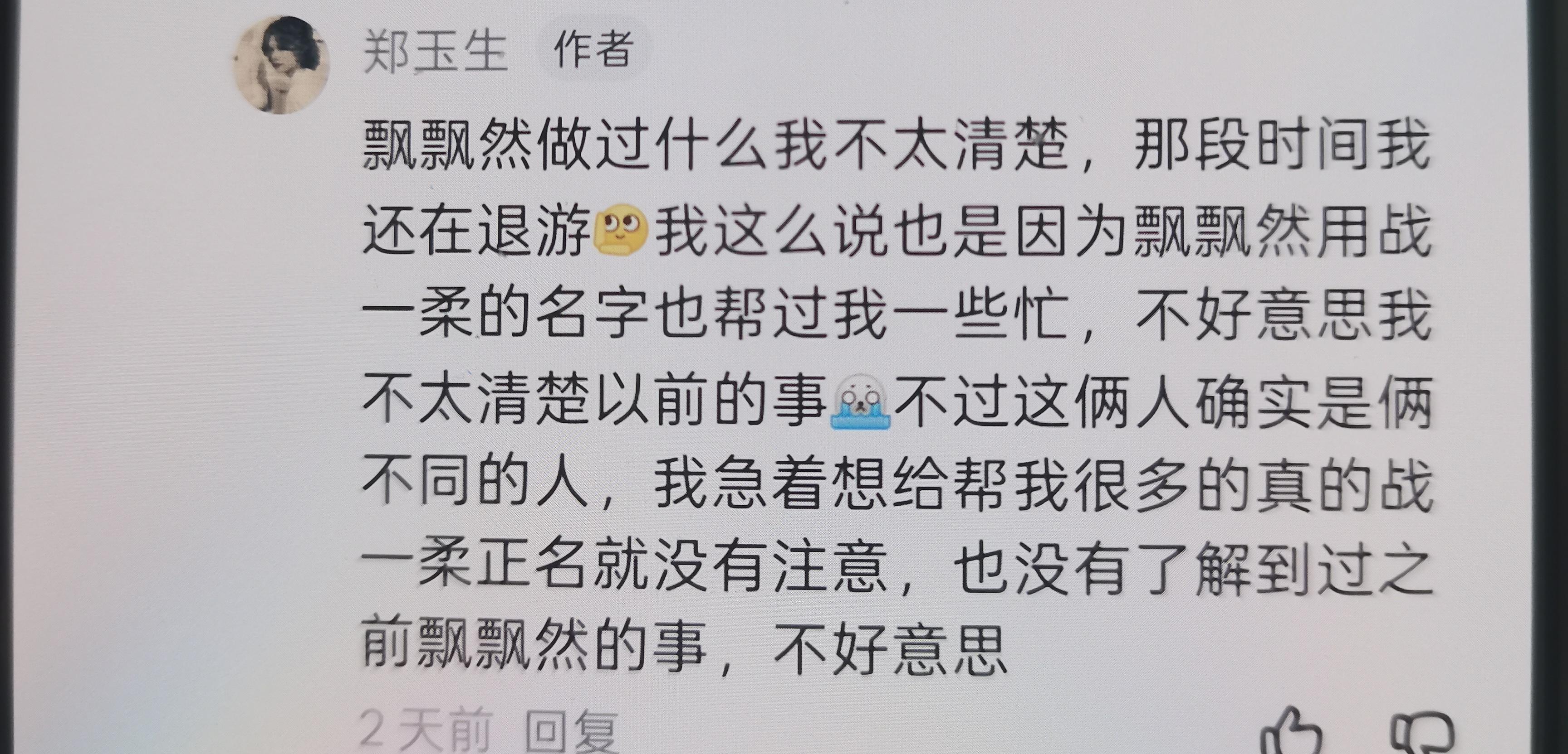 一开始不删帖还好 我本不想说太多,只是后来郑家女娲为了舔小飘 把帖子删了,明知道战一柔是飘飘然冒充的还一个劲的误导玩家,真的很很下头,这点我感觉比我飘飘然还下头,现在人家在她帖子下面说飘飘然都不行了 人家会删评论 生怕把她最爱的飘飘然,给气走了。