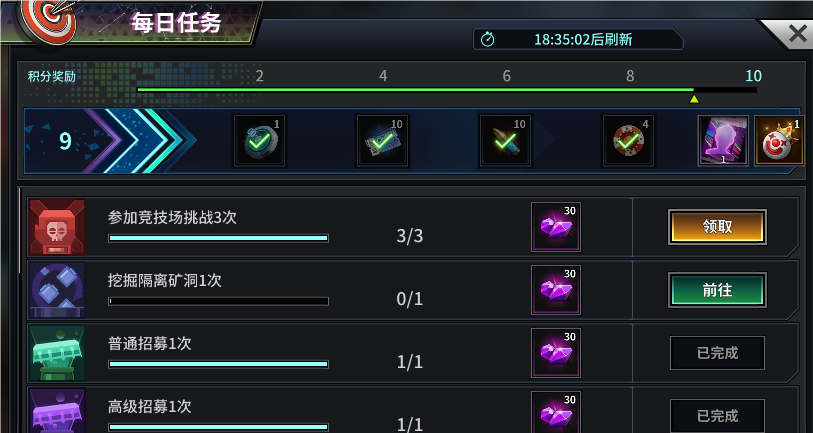 各位探长可通过在边城警视厅完成不同颜色次数任务来领取档位奖励。子弹可用于刷新任务,警徽可用于重置任务。不同任务对英雄的阵营,品级和星级均有不同要求。任务可进行锁定,被锁定的任务不能手动刷新,但每隔24小时会自动刷新。