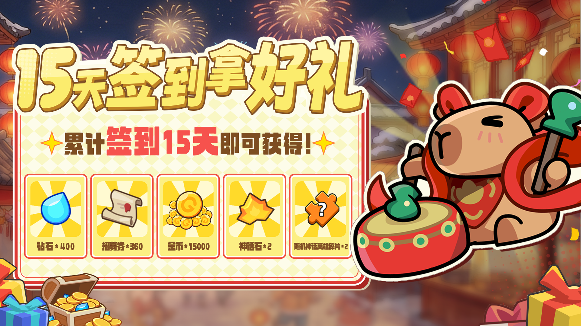 钻石*400、招募券*360、金币*15000
