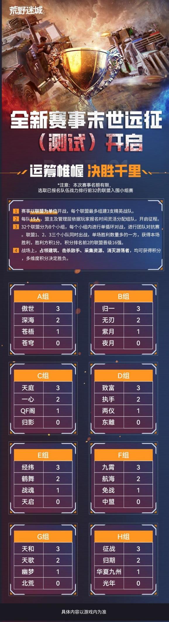 《荒野迷城》全新赛事末世远征(测试)16进8淘汰赛将于12月29日报名开始,比赛时间12月31日20:00开始,请留意自己的对战安排~