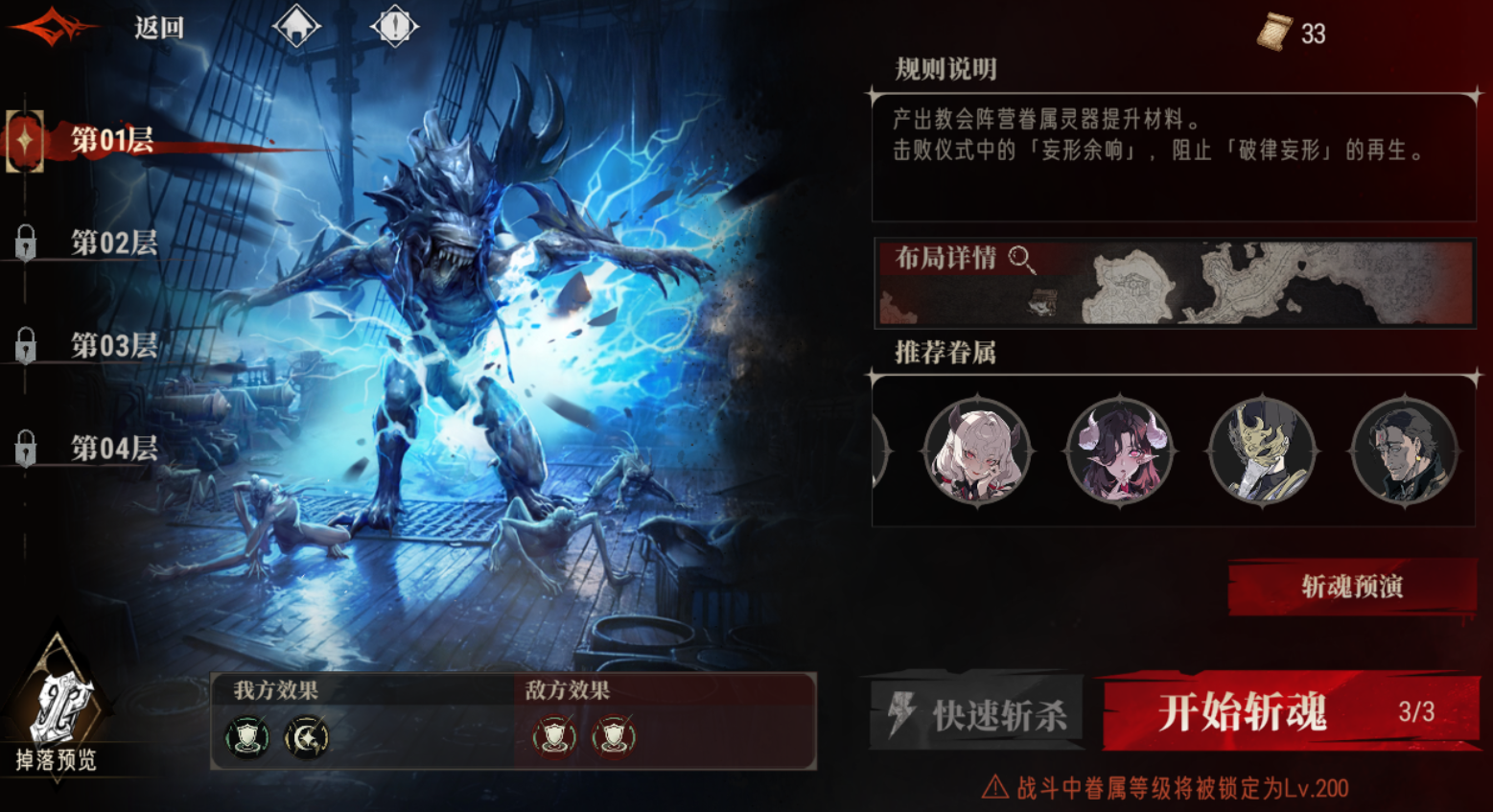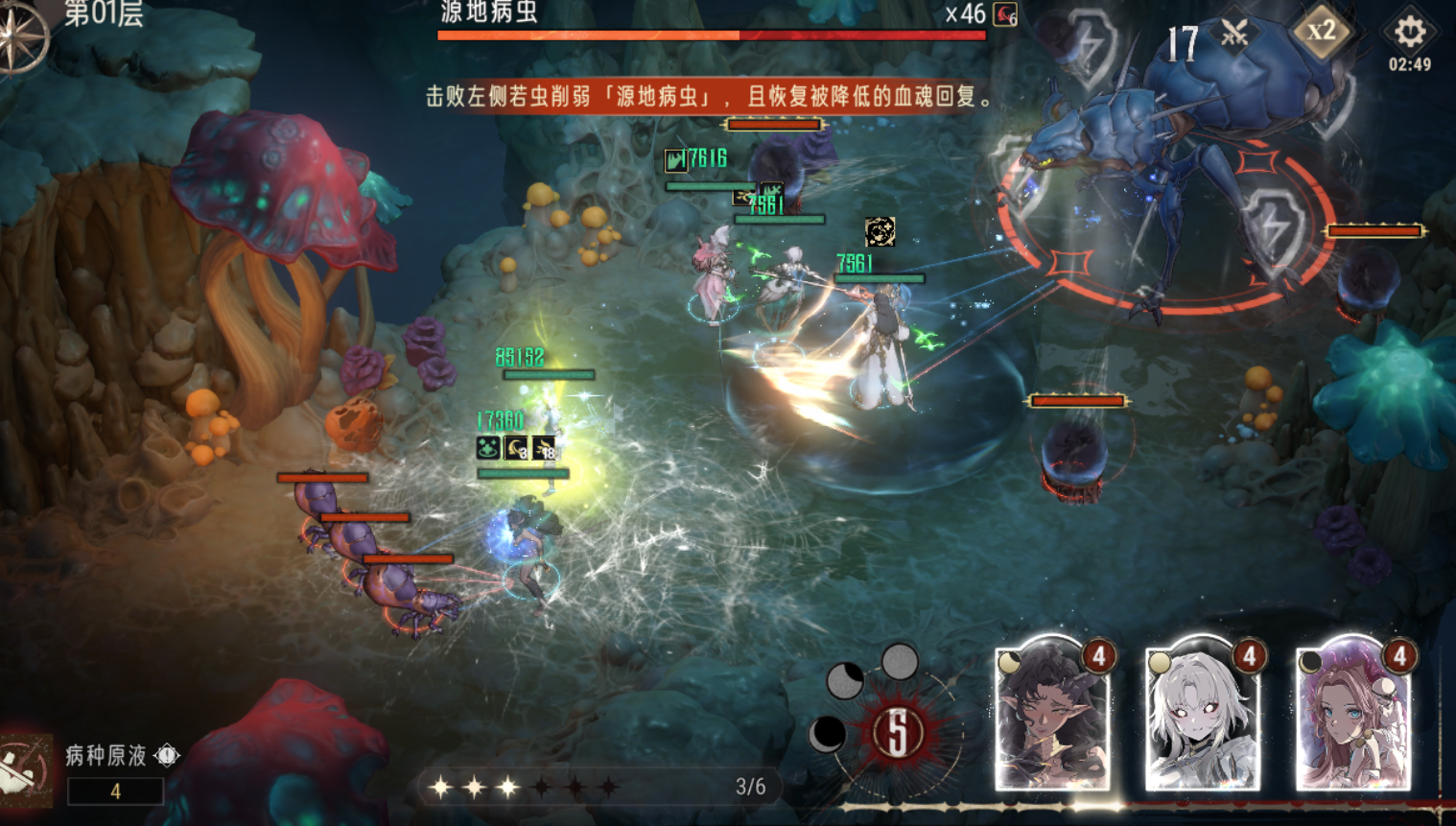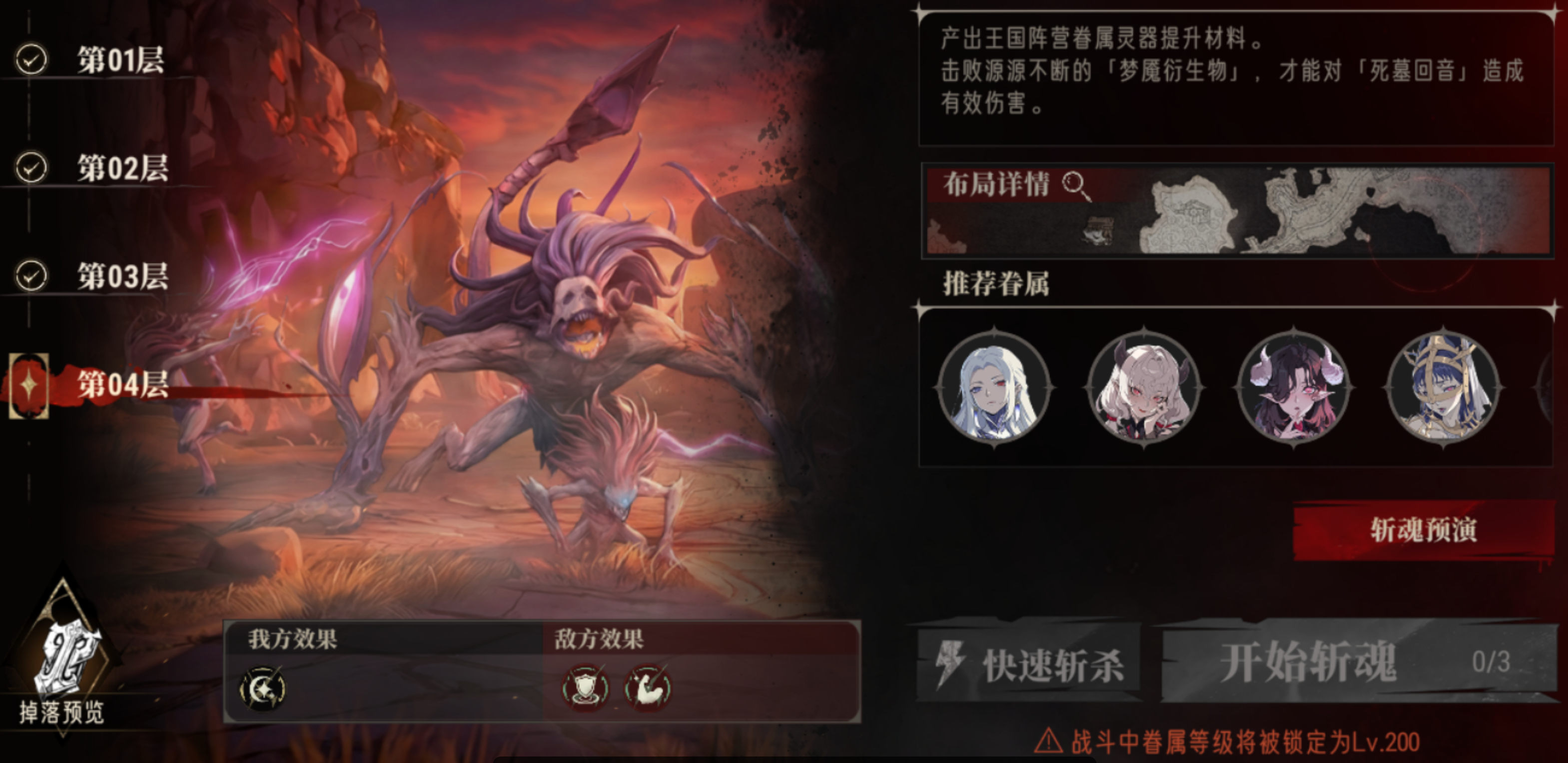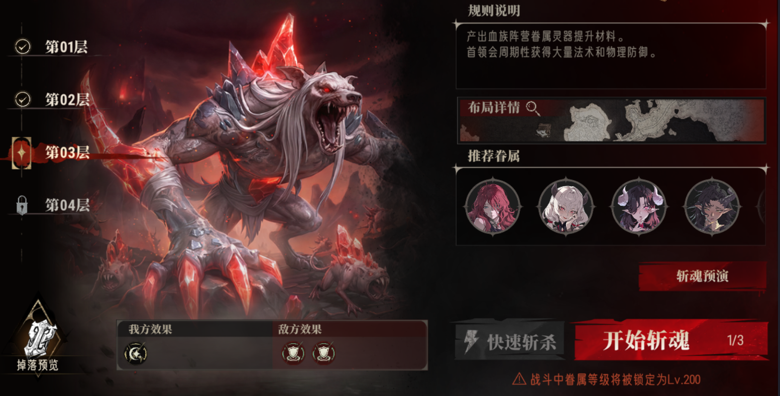这关建议用远程眷属清理右侧蜘蛛,再用单体高爆发眷属打BOSS即可,由于血魂回复速度变慢,可以考虑带一个阿卡贝拉提供回能。