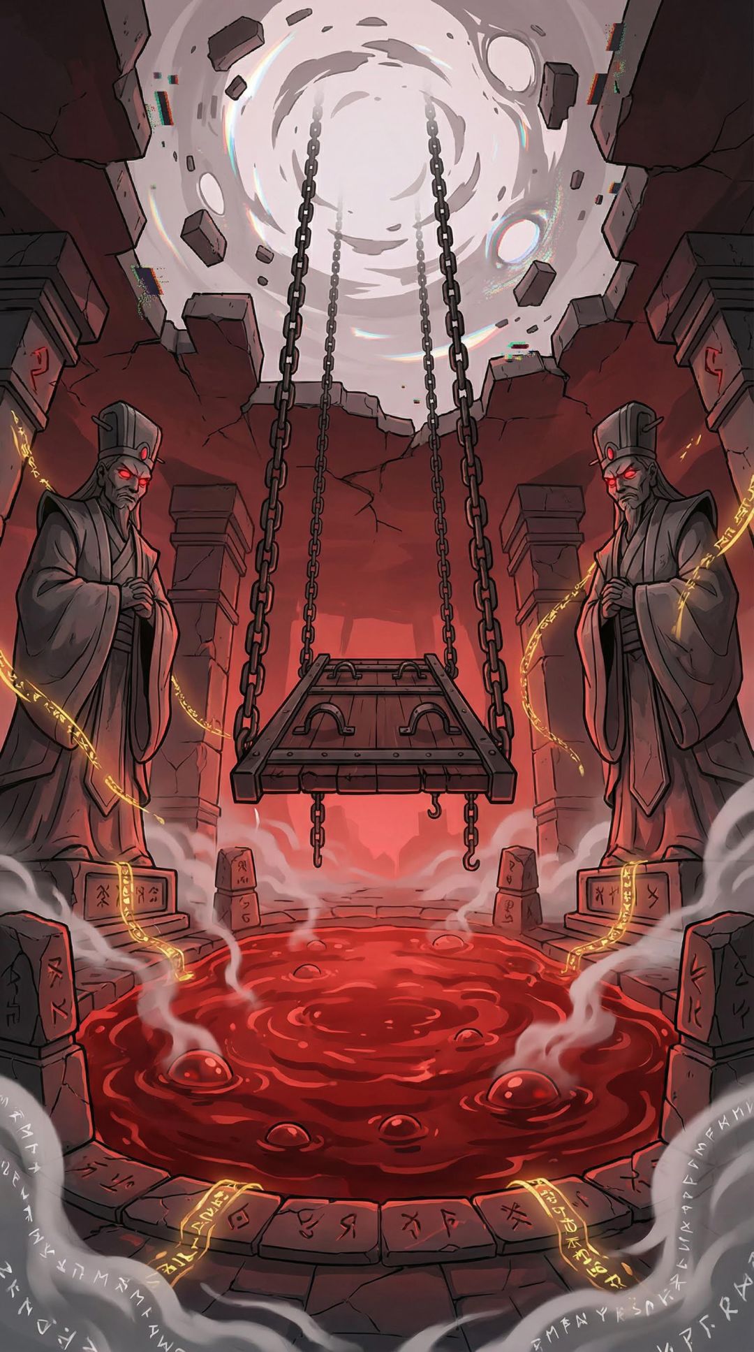血池翻滚、铁链刑架、黑白无常石像眼睛发红光