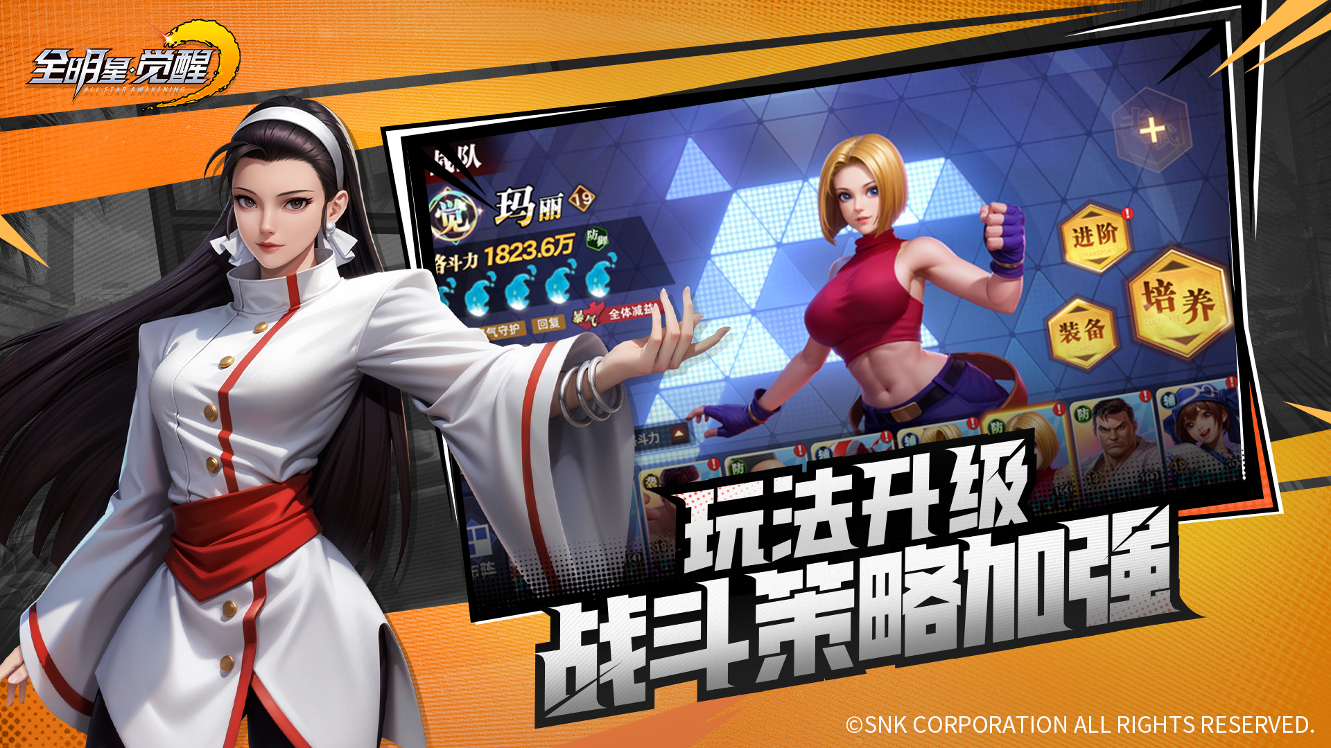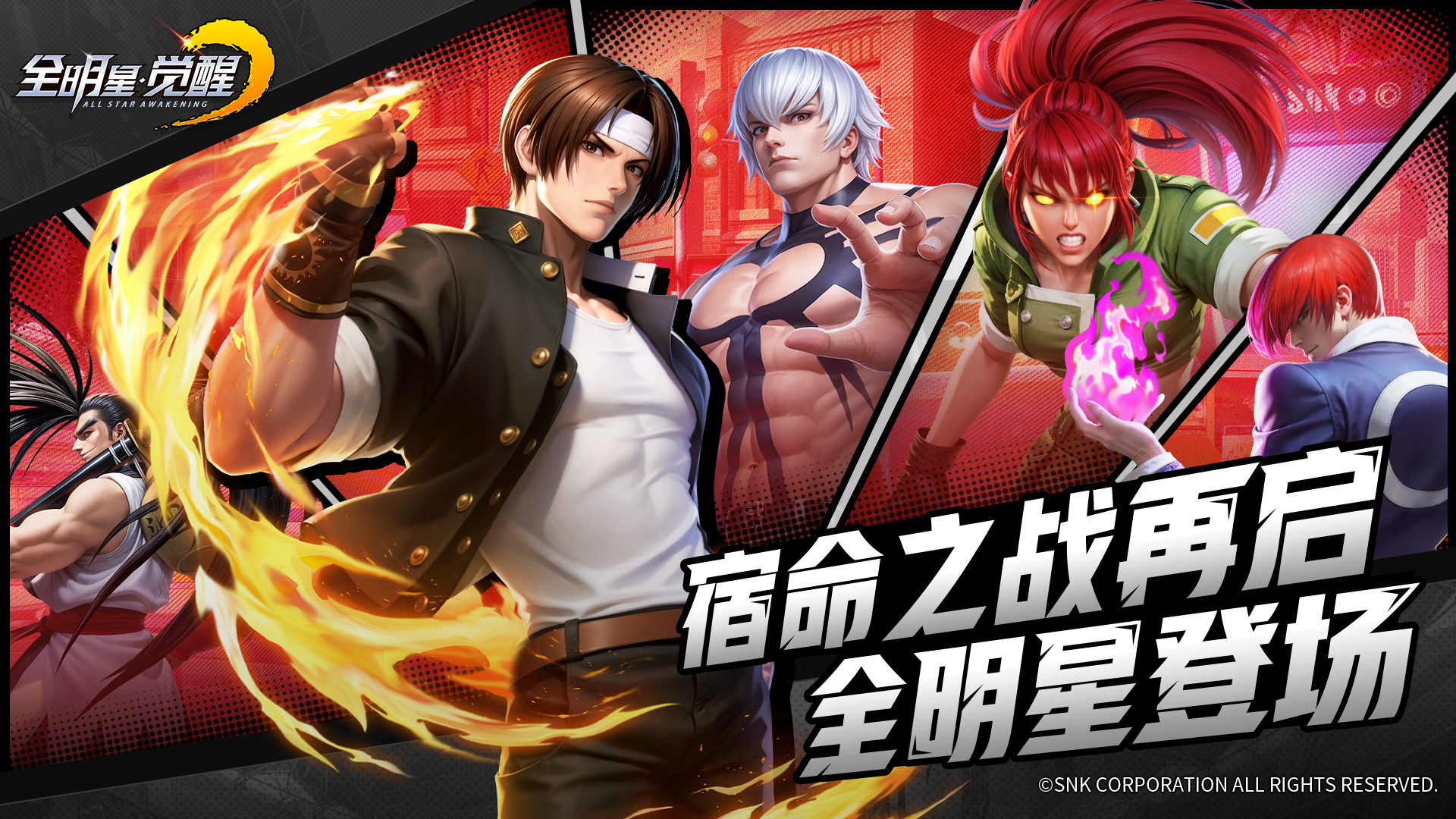 《全明星觉醒》依托SNK官方授权,汇聚八神庵、草薙京、不知火舞、橘右京、娜可露露等50余位格斗明星。