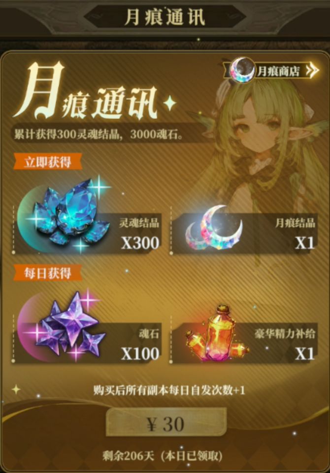 游戏有月卡,月卡给石头,副本次数+1和月痕,月痕可以换黑钢和神木,月卡最多累积6个月