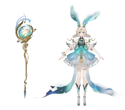 在服装设计上,蓬松短裙版型契合爱丽丝的萌态,轻纱材质随动作飘动,呼应了风的轻盈感。服饰以清蓝和白为主色调,点缀黄金材质的装饰,既契合房日兔的聚宝属性,又提升了造型精致度。