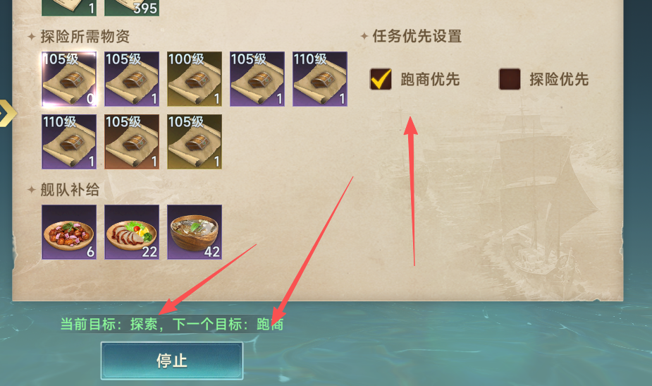 如图,当前是探险,调整了跑商就会在探索执行完后变成跑商了!