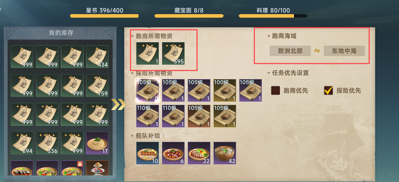 比如选四星书,区域选“欧洲北部→东地中海”,分舰队就会自动跑这条线上利润最高的货物,比如橡树苔、月桂运到北海,再把北海的琥珀带到东地中海。