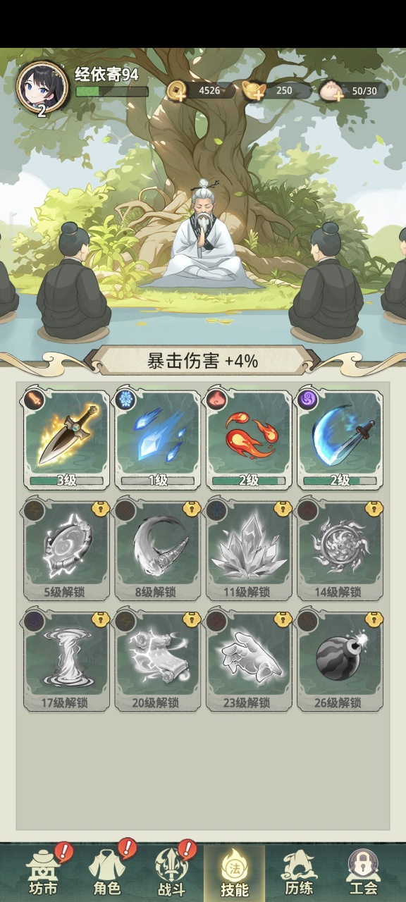 1、技能升级,可提升技能属性,包括技能伤害和暴击伤害加成。当技能升级达到指定级别时,可解锁对应的技能升级效果。