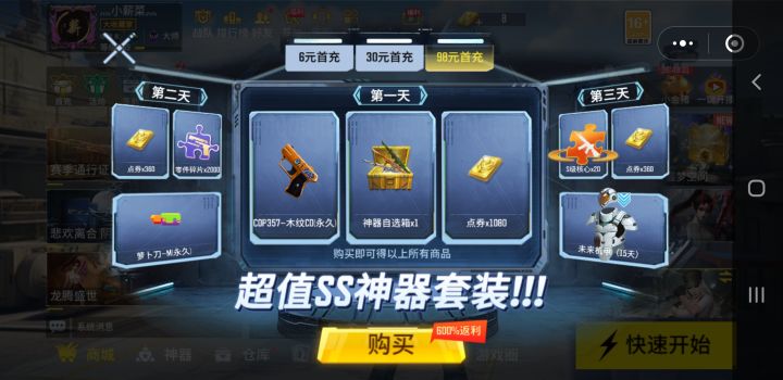 目前,获取该武器的唯一方式便是首充超值大礼包,整整98元即可获得该大礼包。第一天即可获得木纹CD,神器自选箱(鄷都大帝、仲达、年兽、雷震子、黯灭和1080点卷六选一),和1080点卷,第二天可获得360点卷和2000零件碎片和萝卜刀,第三天可获得20个S核心,360点卷和未来机甲。