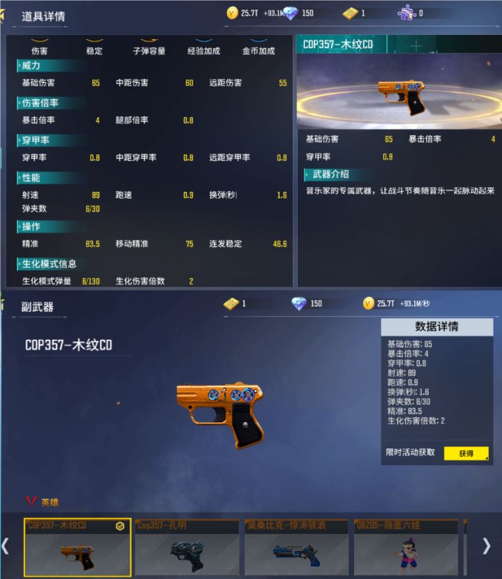 在全民枪神中,COP357手枪系列一直都很强。同样这把COP357-木纹CD也很强势!两发子弹下去必死无疑,堪比酉鸡,洞箫。超高伤害的子弹和超速的射速让你点射扫射也能精准击败敌人。炫酷的手枪外形发散这音符,动感十足!