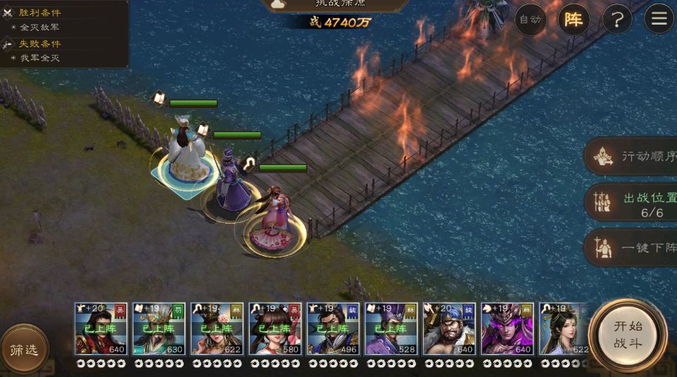 这一关徐庶站桥中间,两边有火,根本过不去,近战英雄一点用都没有,主要输出还得周瑜啊!用法师或者弓打,我弓只有许褚又是近战,所以用这个阵容打,曹操、诸葛亮加buff,李儒、周瑜叠毒火持续伤害打。