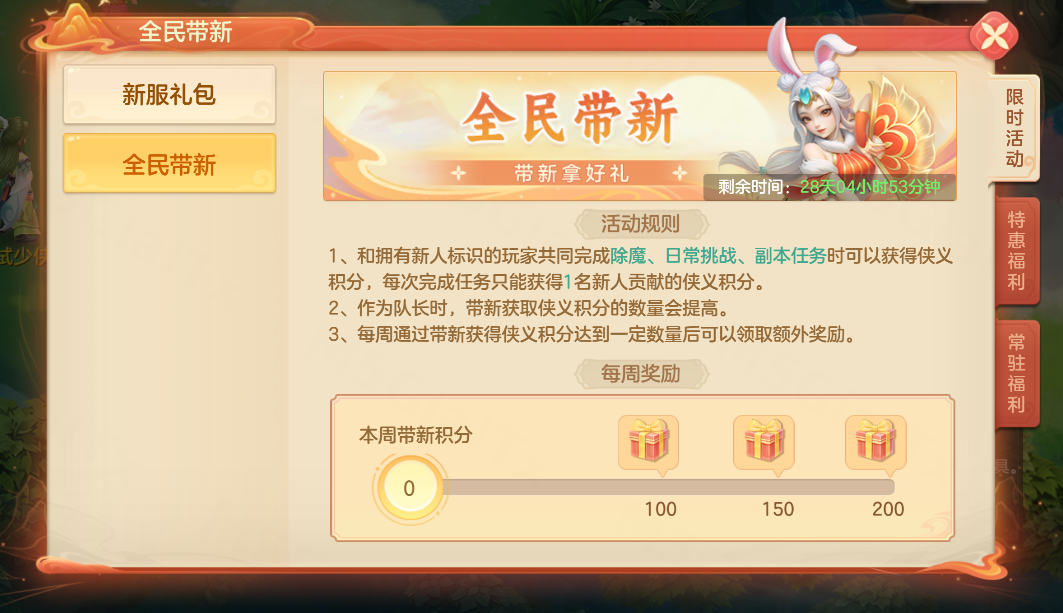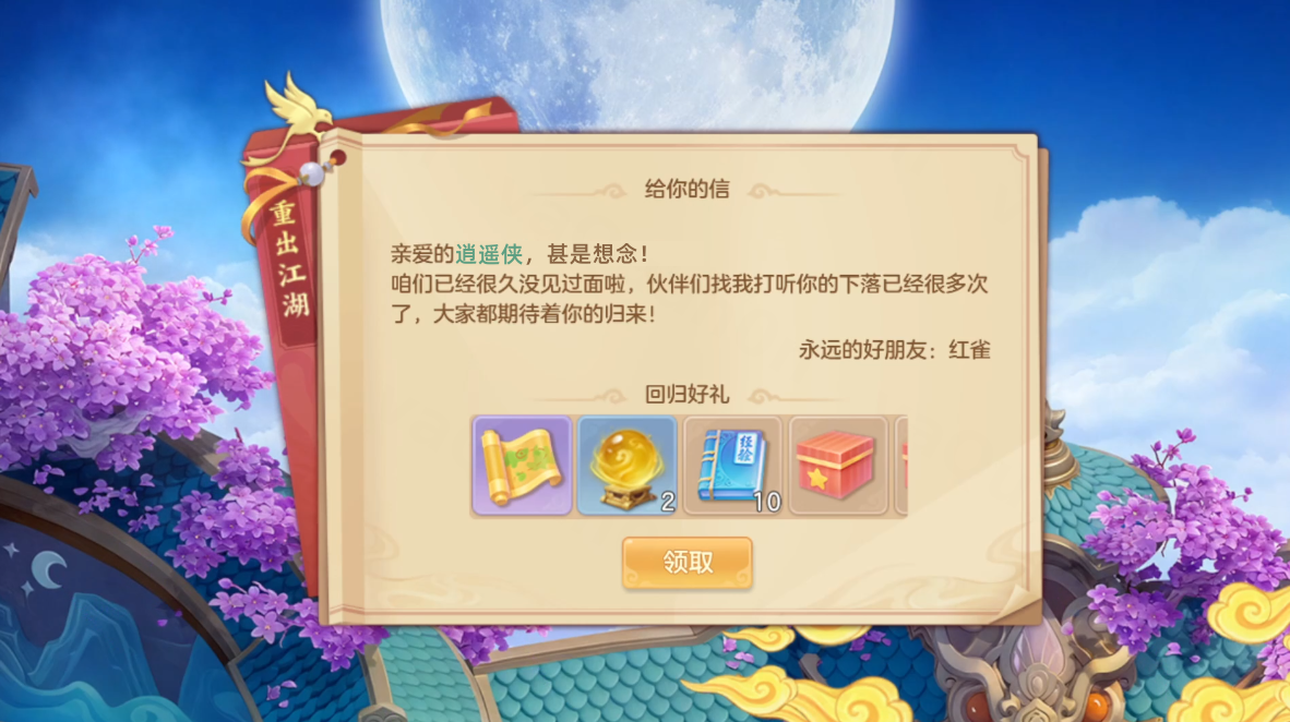 活动期间回归的少侠立即获得一份回归礼包,可获得超级宝图、装备宝珠、人物经验心得、宠物项圈礼盒、宠物铠甲礼盒,助你重出江湖。