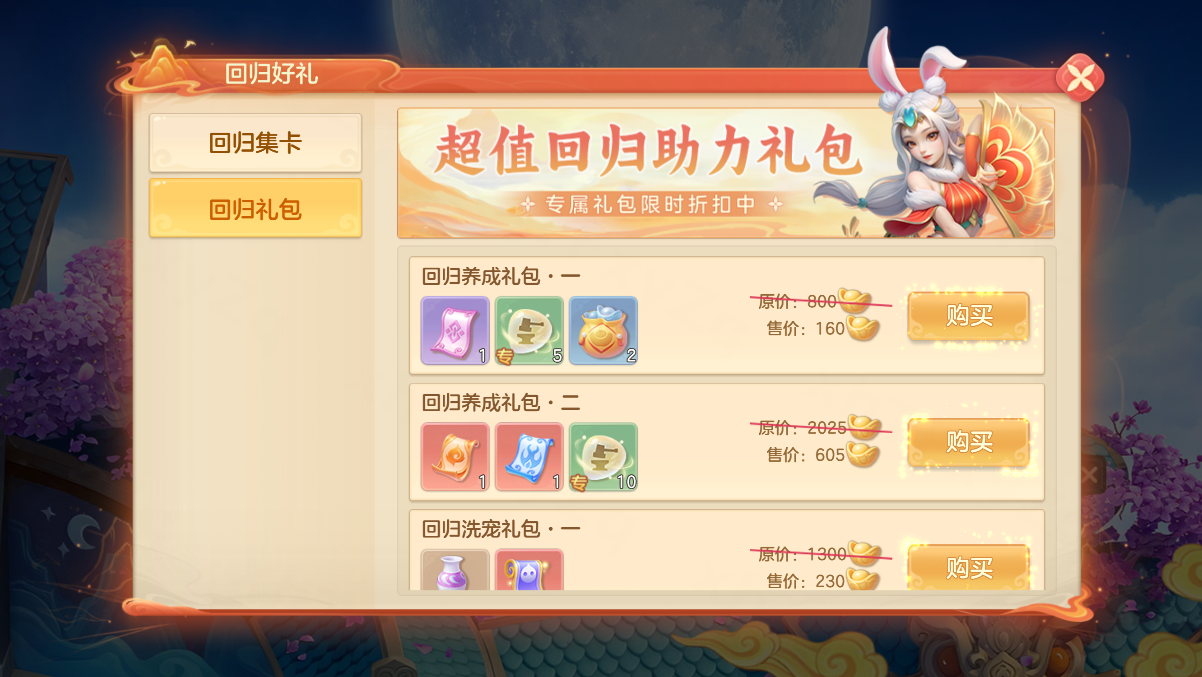 少侠可以在回归系统中购买超值回归助力礼包,享受专属礼包限时折扣!各礼包折扣力度均在二折左右,助力少侠快速追赶!