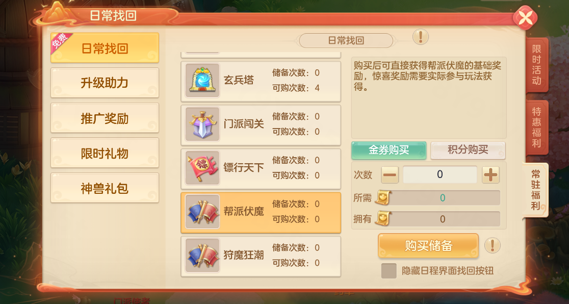 每天有未完成的日常奖励次数时,可转化为可购买次数到日常找回处找回,轻松追赶落后进度,新服活动期间找回全免费!