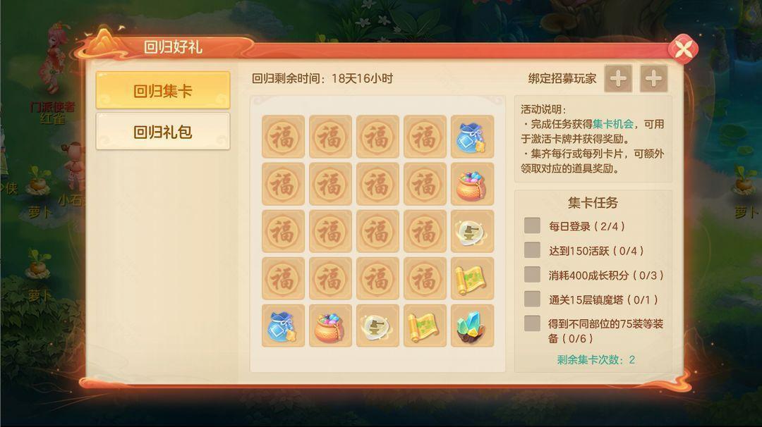 完成回归任务参与集卡,即可获取丰厚奖励。完成登录、活跃等简单任务,翻开每行或每列的卡片,最多可获得奇珍异石*1、超级宝图*2、精品宝石包*2、宝图碎片*2、通用打造灵*2!