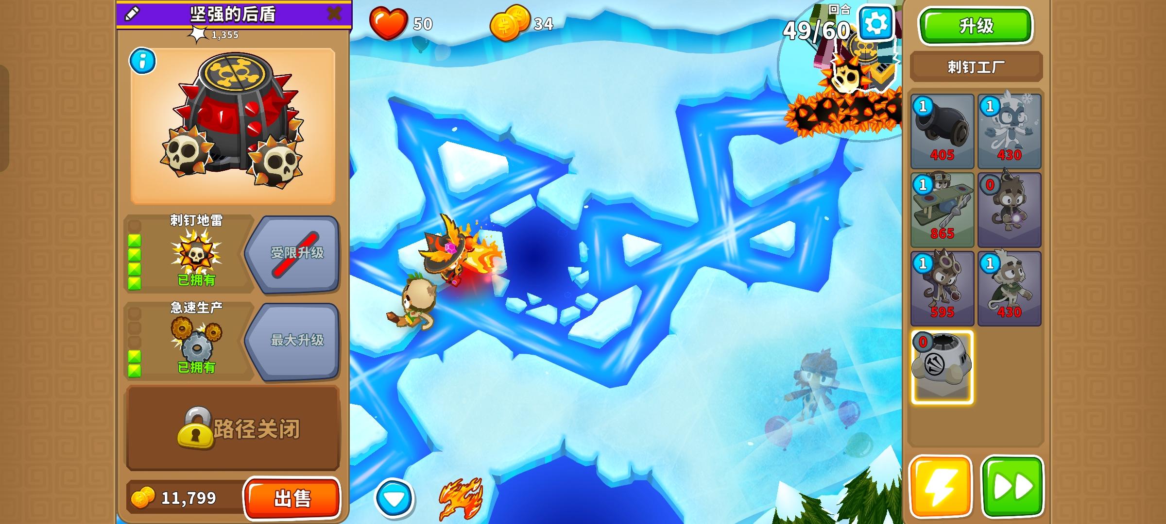 岛2:也是同样的战术,只是这次可以加个204冰猴增加伤害,如果担心漏掉紫气球,就来个120刺钉工厂守住防线吧!