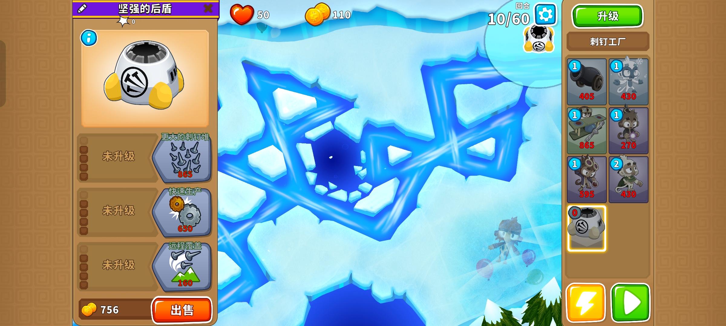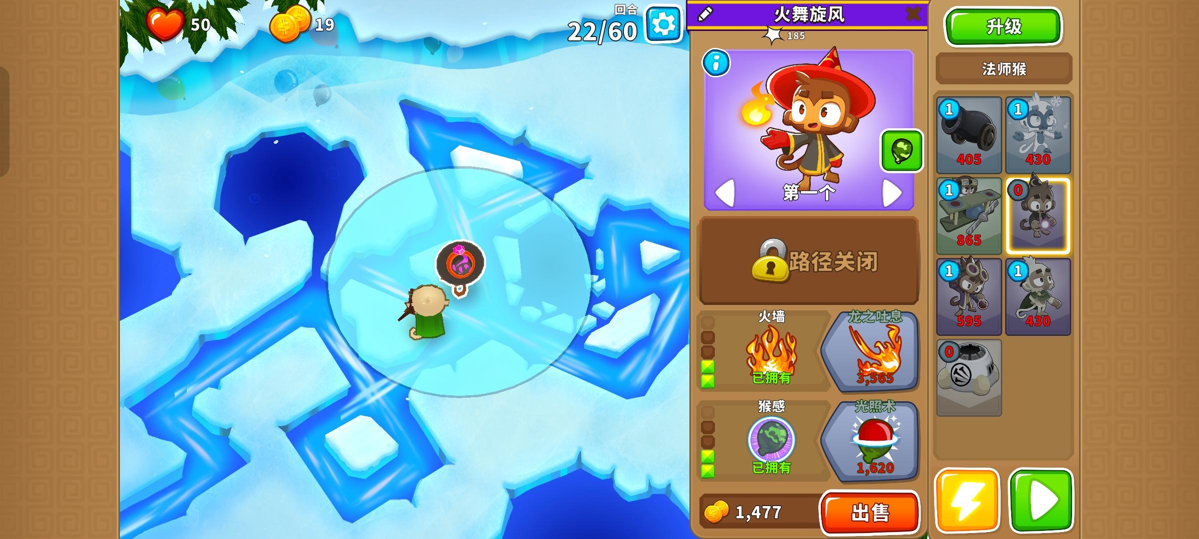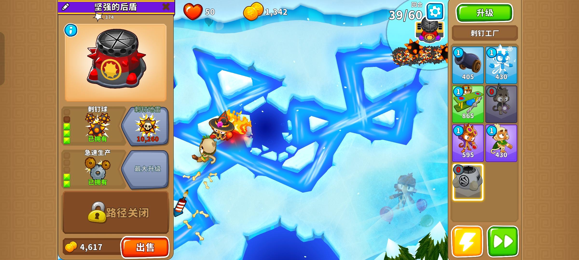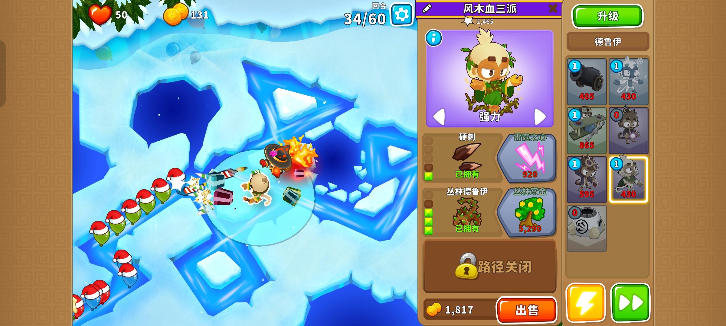 岛3:从此开始变得困难,开局两个德鲁伊,并把前面的德鲁伊升到100,第10回合结束后全卖了换成刺钉工厂放在右上角守家,钱够了再在熟悉的位置放下德鲁伊,目标强力,先升到110,然后再在上方放下法师猴,先升中路两级再升下路两级,并升到032。现在就能把德鲁伊升到130了,并把刺钉工厂升到320来查漏补缺。最后就把法师猴升到042,刺钉工厂升到420,必要时使用法师猴的技能,就能有惊无险地通过!