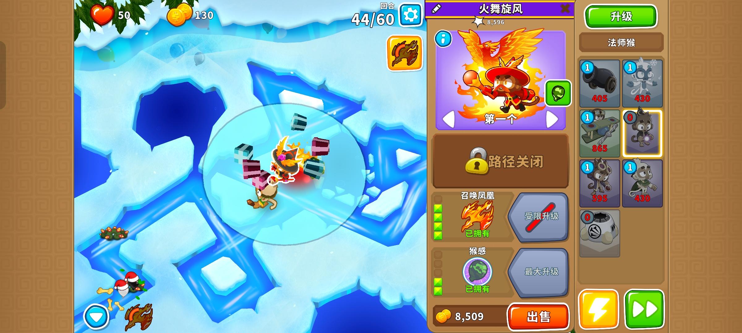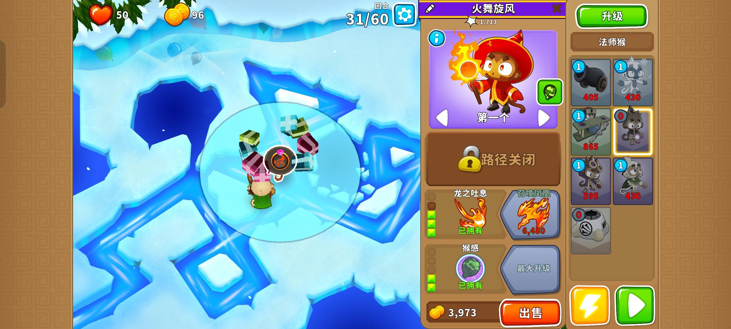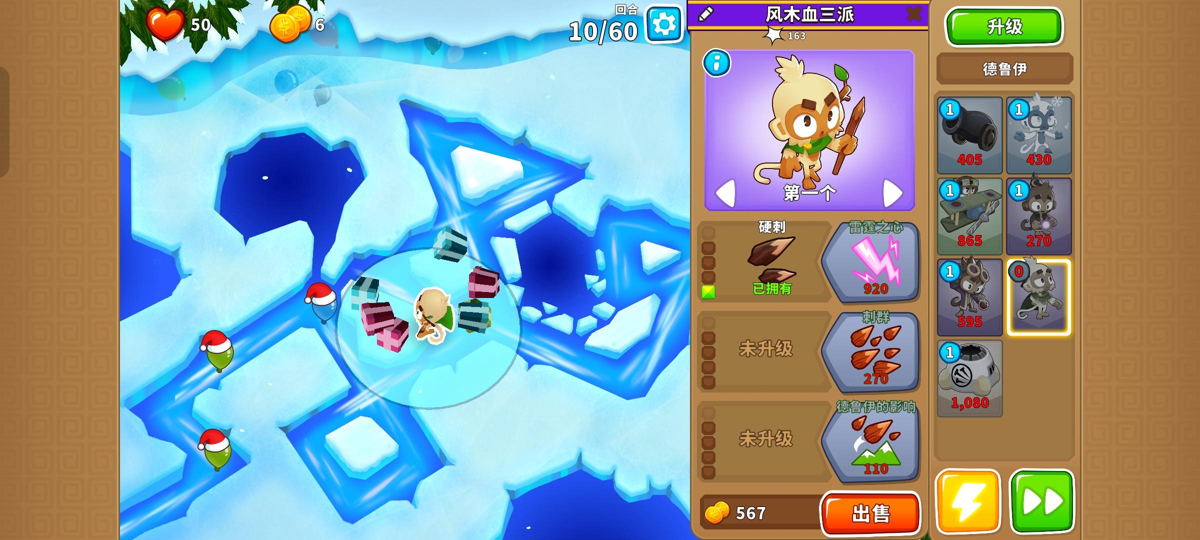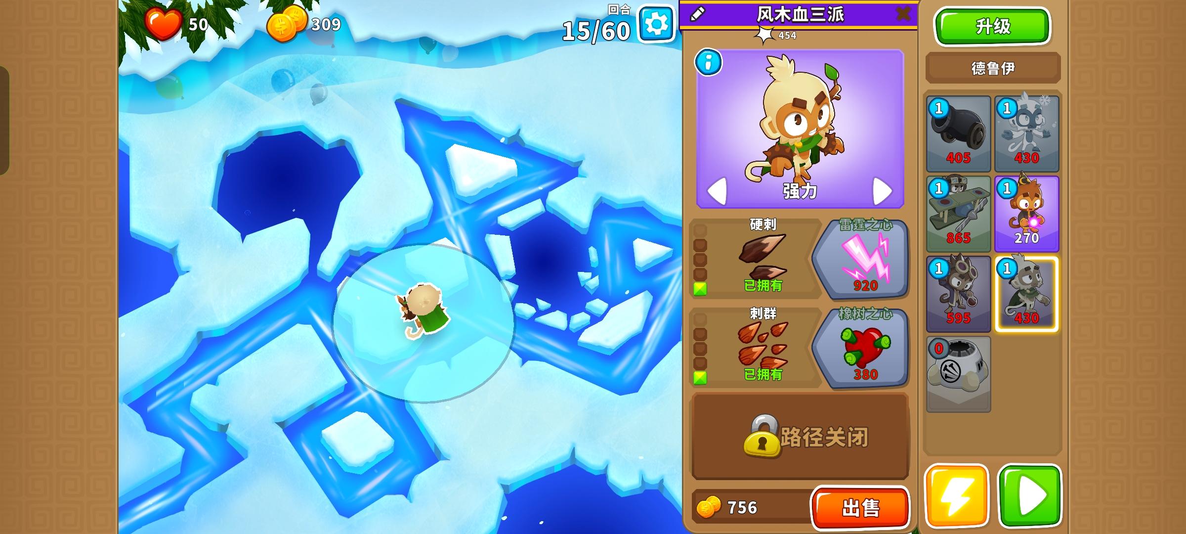 岛1:开局两个德鲁伊,钱够了把前面的德鲁伊升到030,然后补上032法师猴,轻松通过!