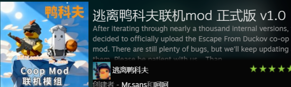 《逃离鸭科夫》玩家期待已久的联机mod正式版1.0惊喜发布,该mod由Mr.sans和InitLoader联合打造,是此前Beta v1.2.1先遣测试版的后续迭代版本。