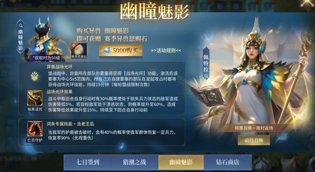 活动期间,可使用钻石购买限定五星异兽【幽瞳魅影】。盟战图中,部队在携带【幽瞳魅影】后,其所在的自建要塞将获得【战场光环】效果,在激活后的15分钟内,周围己方自建要塞中的部队在出征时将会获得强化效果。