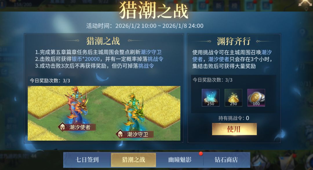 活动期间,主城范围整点内会刷出【潮汐守卫】,击败【潮汐守卫】即可获得银币奖励与活动道具【挑战令】。使用【挑战令】可以召唤出强大的【潮汐使者】,与盟友集结并成功击败【潮汐使者】即可获得丰富奖励!