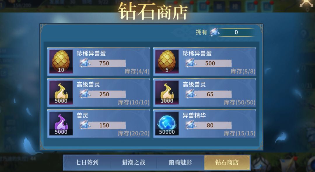 活动期间,可使用钻石在钻石商店中购买珍稀异兽蛋、高级兽灵等稀有养成道具
