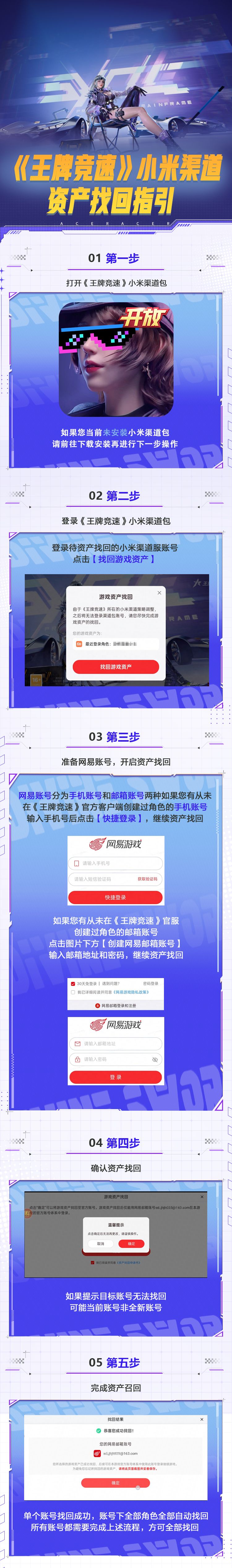 角色资产找回转移现已开启。当前使用小米渠道包体登录《王牌竞速》的车手们,可以查看下方相关操作指引将角色资产找回并转移至官服~车手们也可以前往公众号后台回复“小米迁移”查看更多攻略与指引。