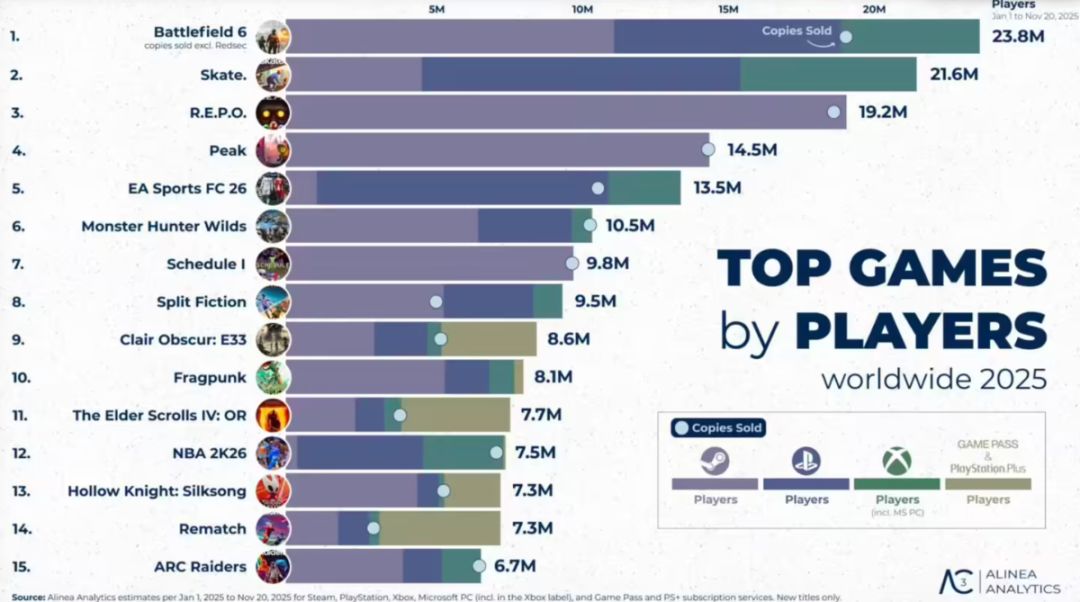 数据分析公司Alinea Analytics发布2025年游戏市场分析报告,统计范围覆盖今年1月1日至11月20日。在全球玩家规模榜单中,《战地风云6》登顶年度玩家数榜首,统计未包含其免费大逃杀模式《禁区冲突》,Xbox Series、PS5 及 PC 全平台合计购买玩家数高达238 万人,成为年度最热门买断制游戏。