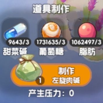 2.左旋肉碱=3甜菜碱+3葡萄糖+3脂肪(葡萄糖可以用栗子,千秋雕像大量获取)(脂肪可以用希子雕像大量获取)