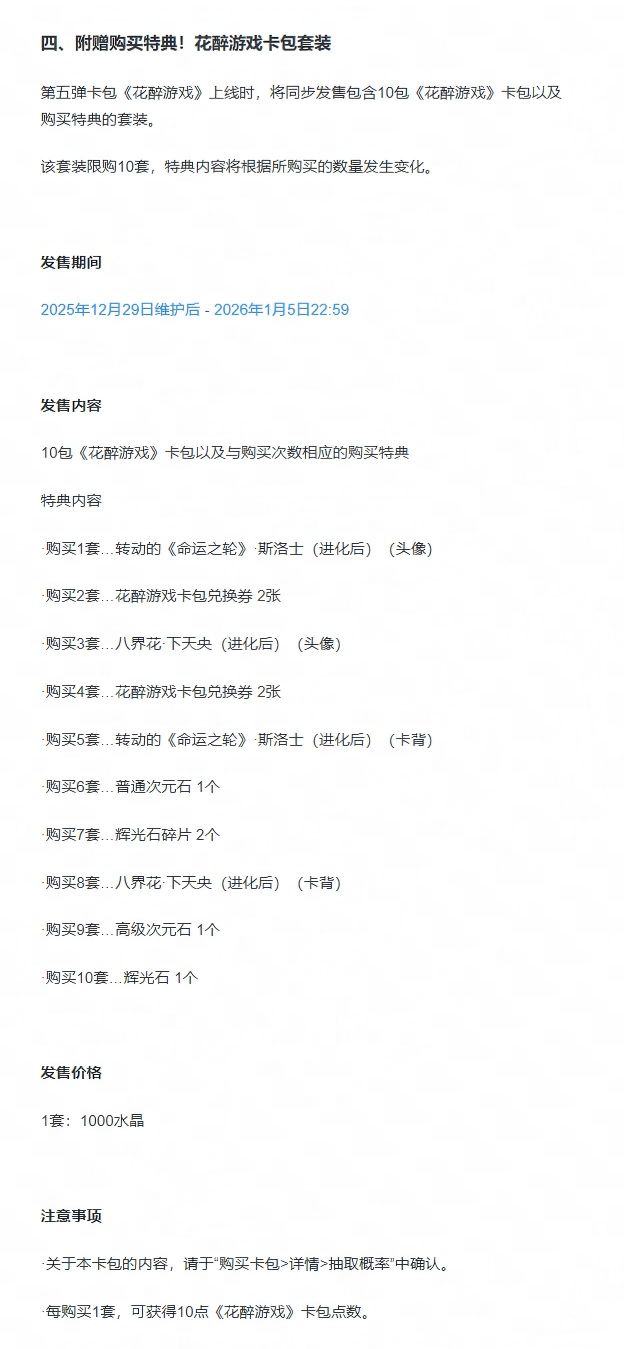 亲爱的各位牌友,第五弹卡包“花醉游戏”已于今日13:30正式上线!以上为本弹的相关更新公告,请牌友们查阅。