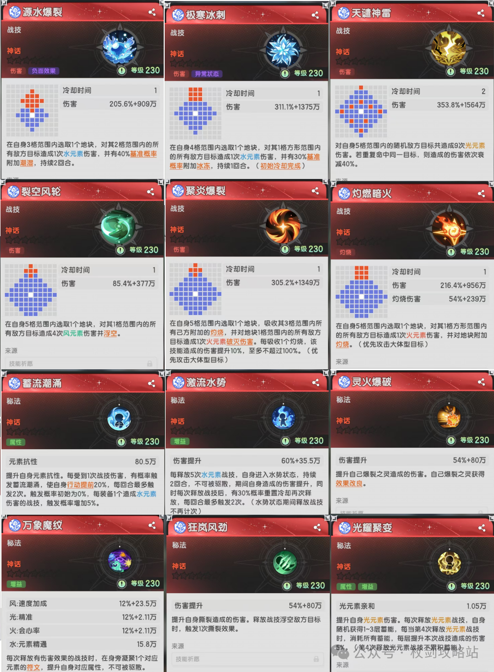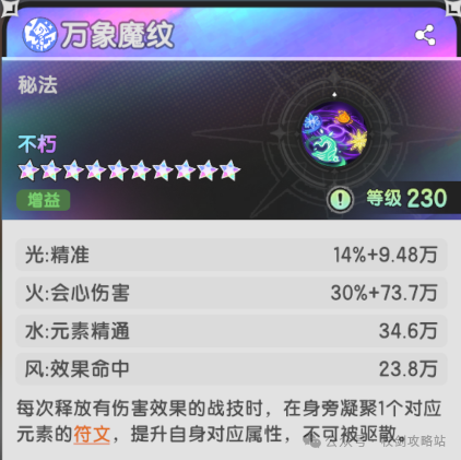 万象魔纹:加上六转更新的一些新技能,算是进一步补强了四系玩法的伤害,只需要替换一下原先的技能就行。不过目前水和风的技能效果相对来说还是比较拉垮,看看后续能不能再进一步提升一下。
